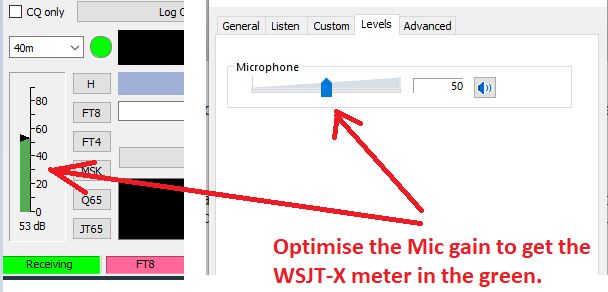 Next step whilst looking at the USB Audio Device Microphone settings, is to look in the Levels tab and optimise the level slider such that you put the receive level bar-graph in WSJT-X about mid-range. You can optimise these settings as you become more familiar with the software.